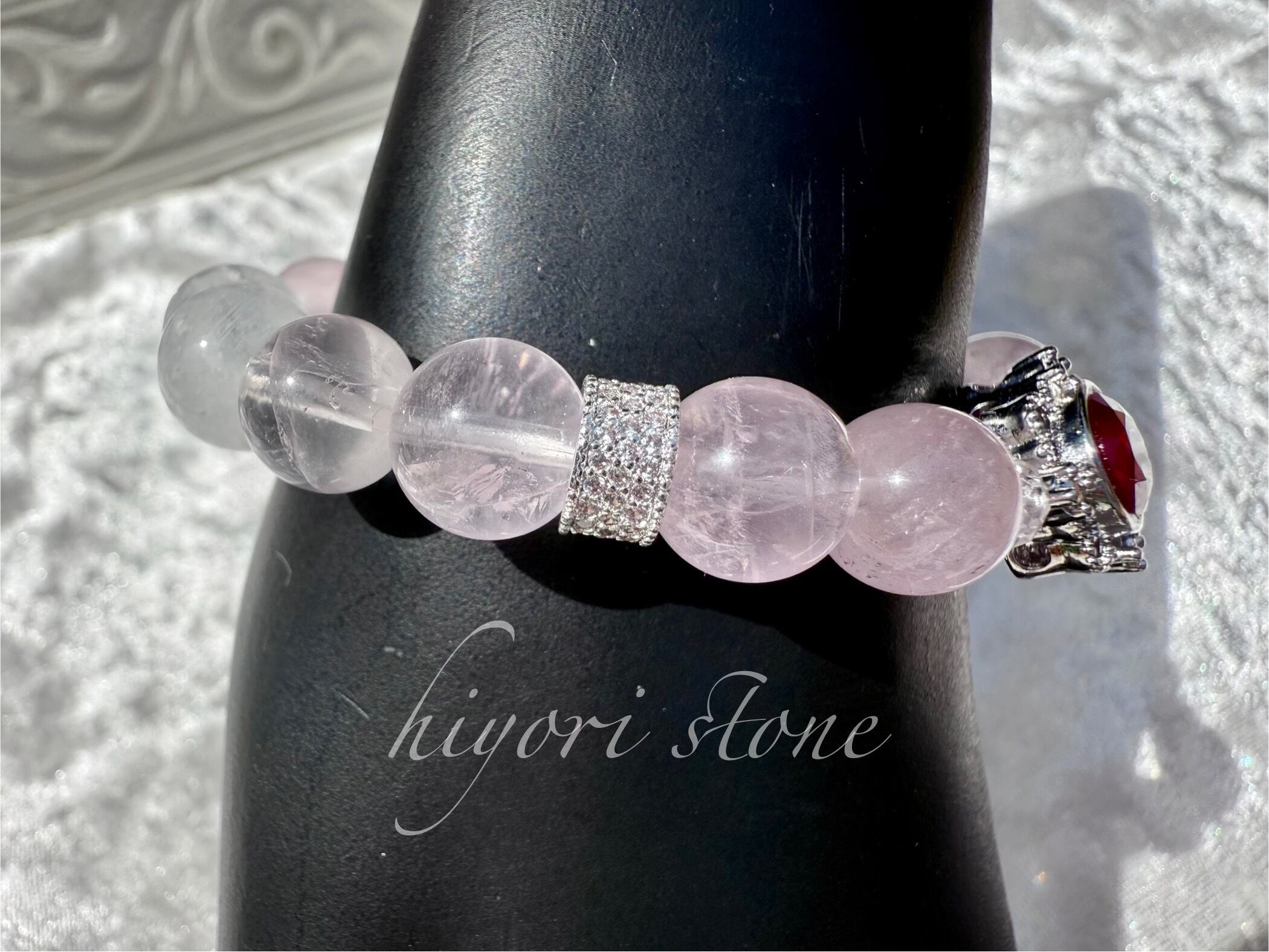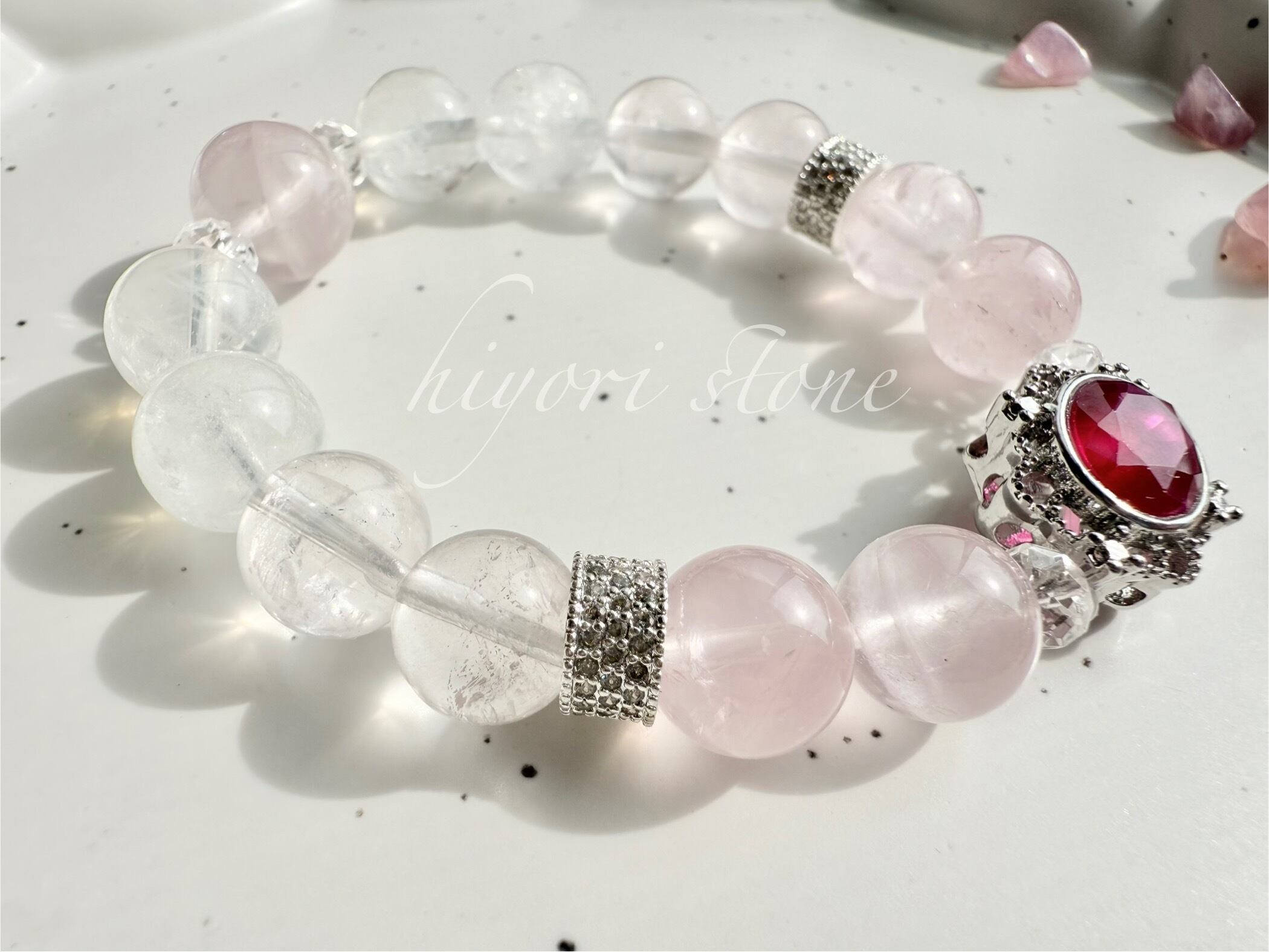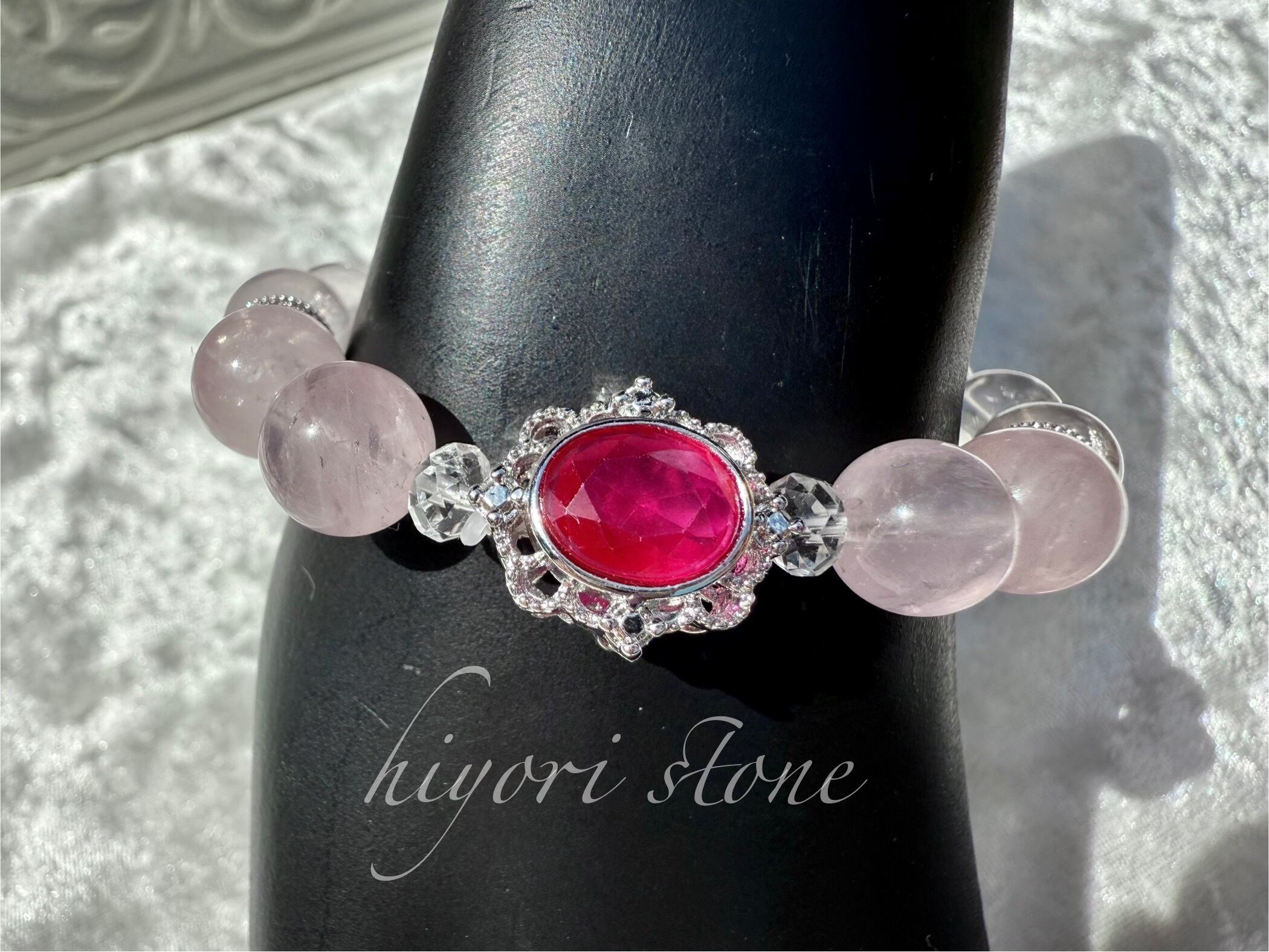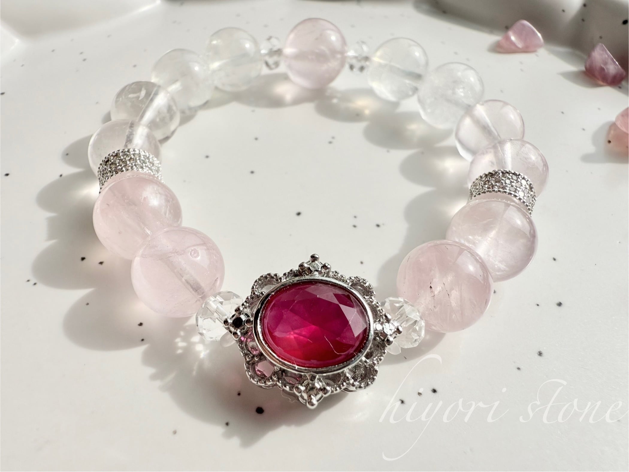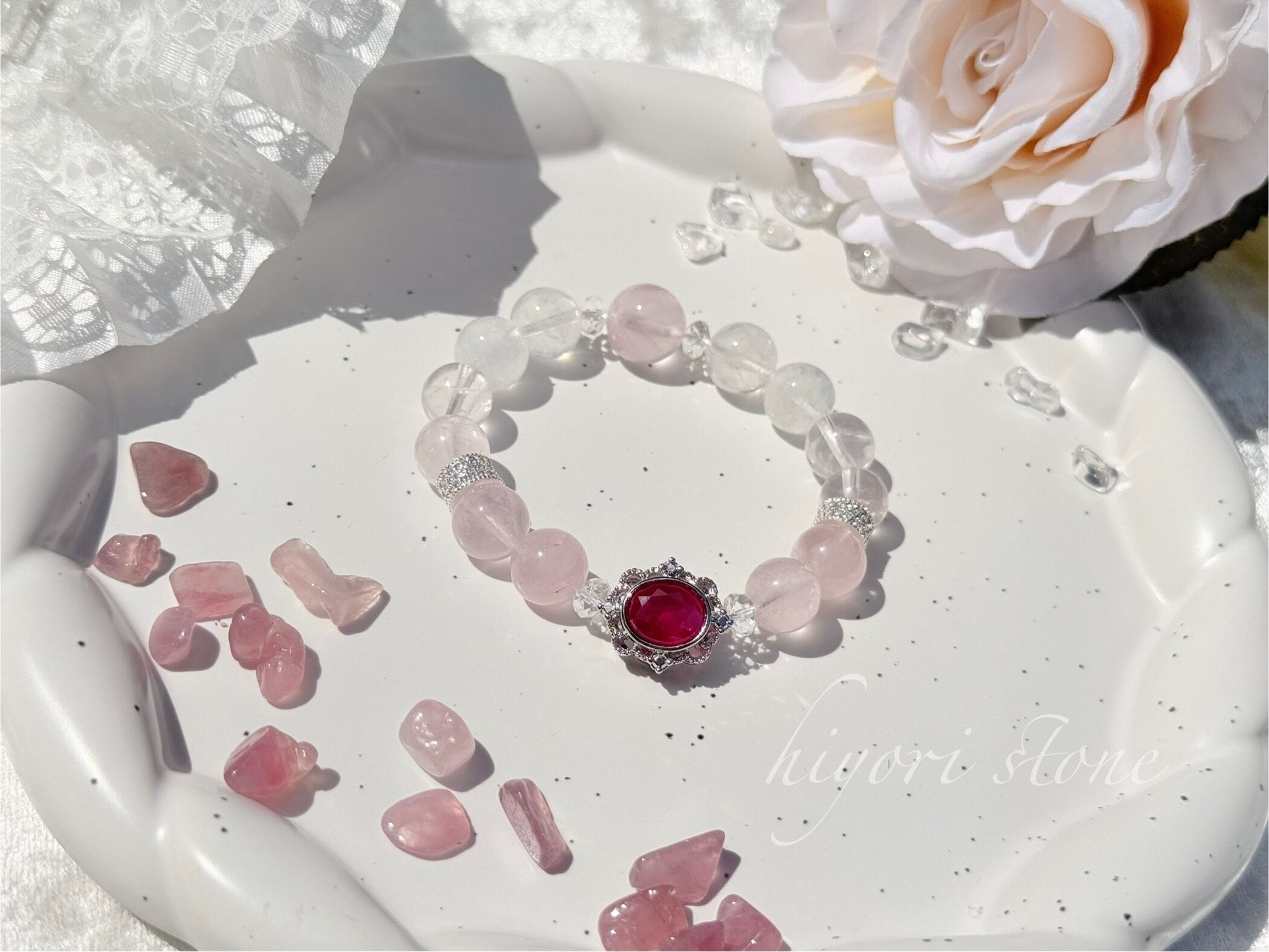 そんなルビーを優しく包むように、淡いカラーのローズクォーツと涼しげなカラーのエンジェルラダーを組み合わせました。