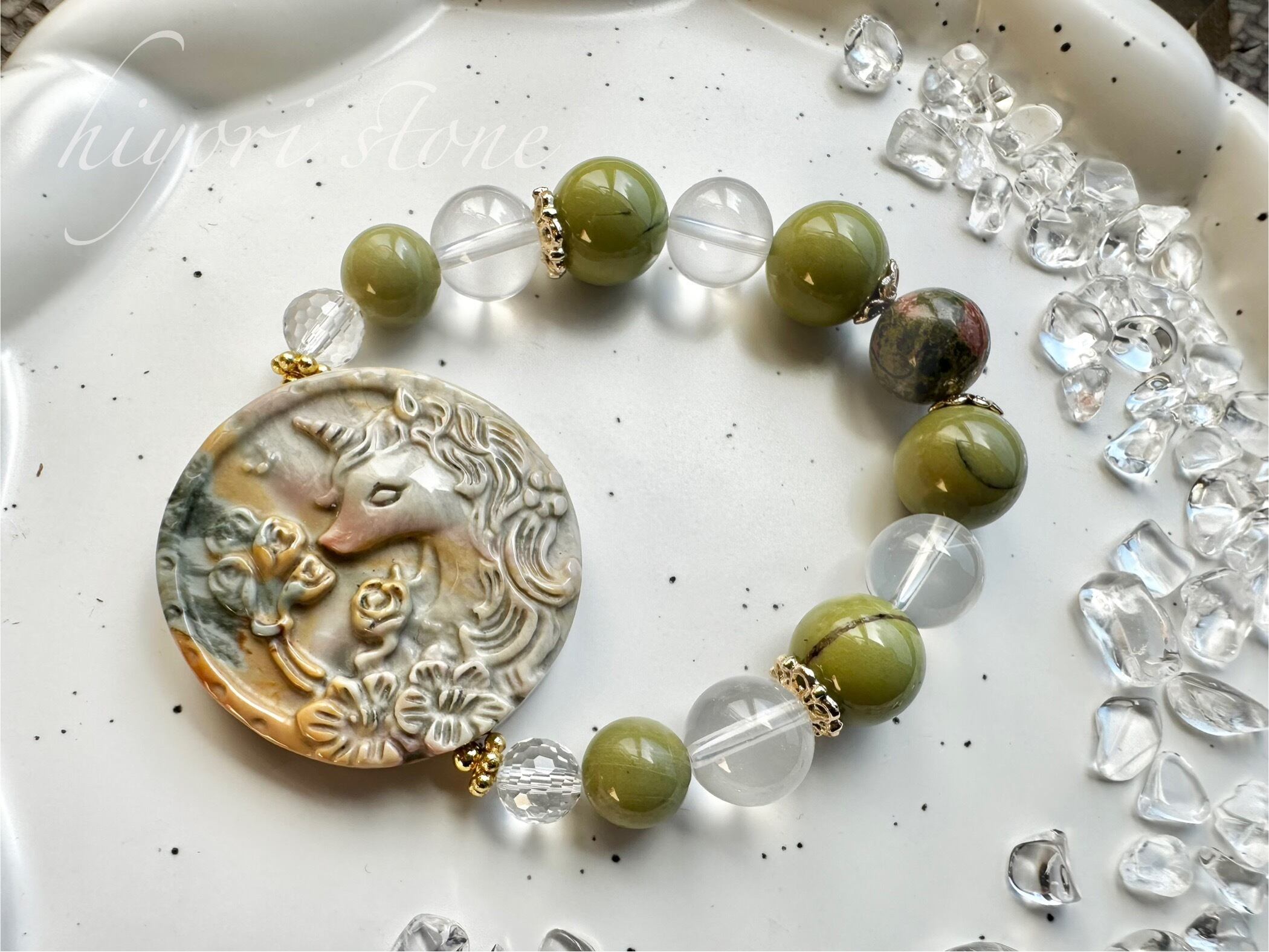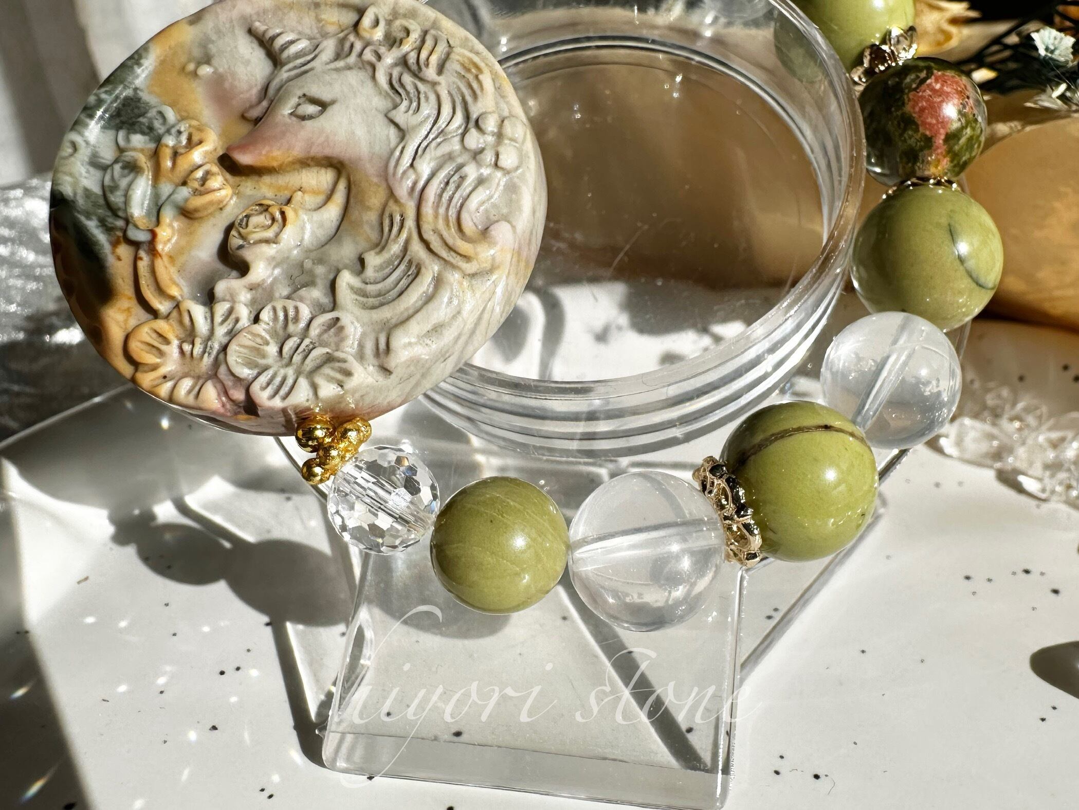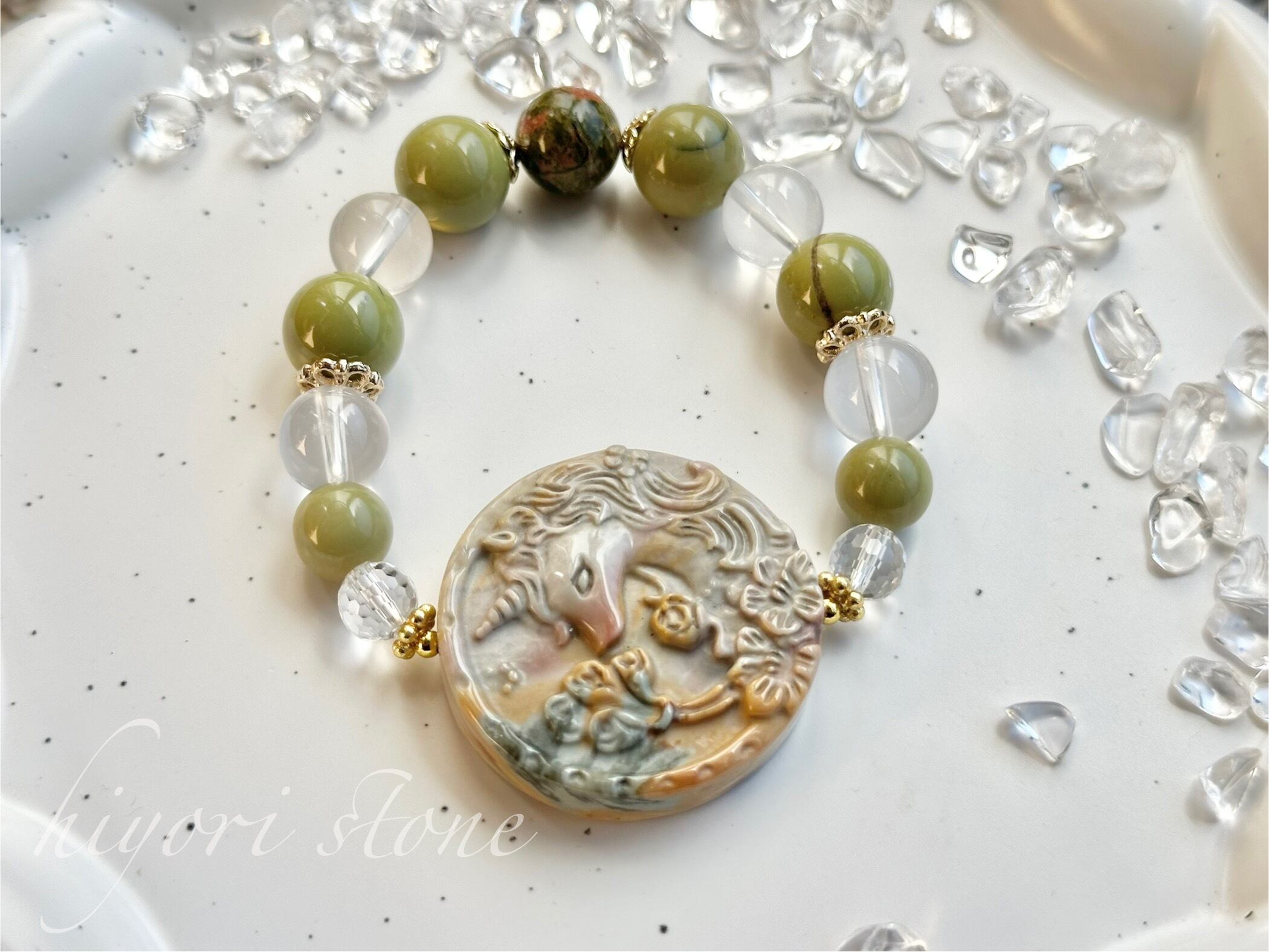こちらのデザインブレスレットは、ユニコーンの彫刻が施されたアラシャン瑪瑙をメインにあしらい、ユナカイト・ミルク水晶・水晶を組み合わせて仕上げています。