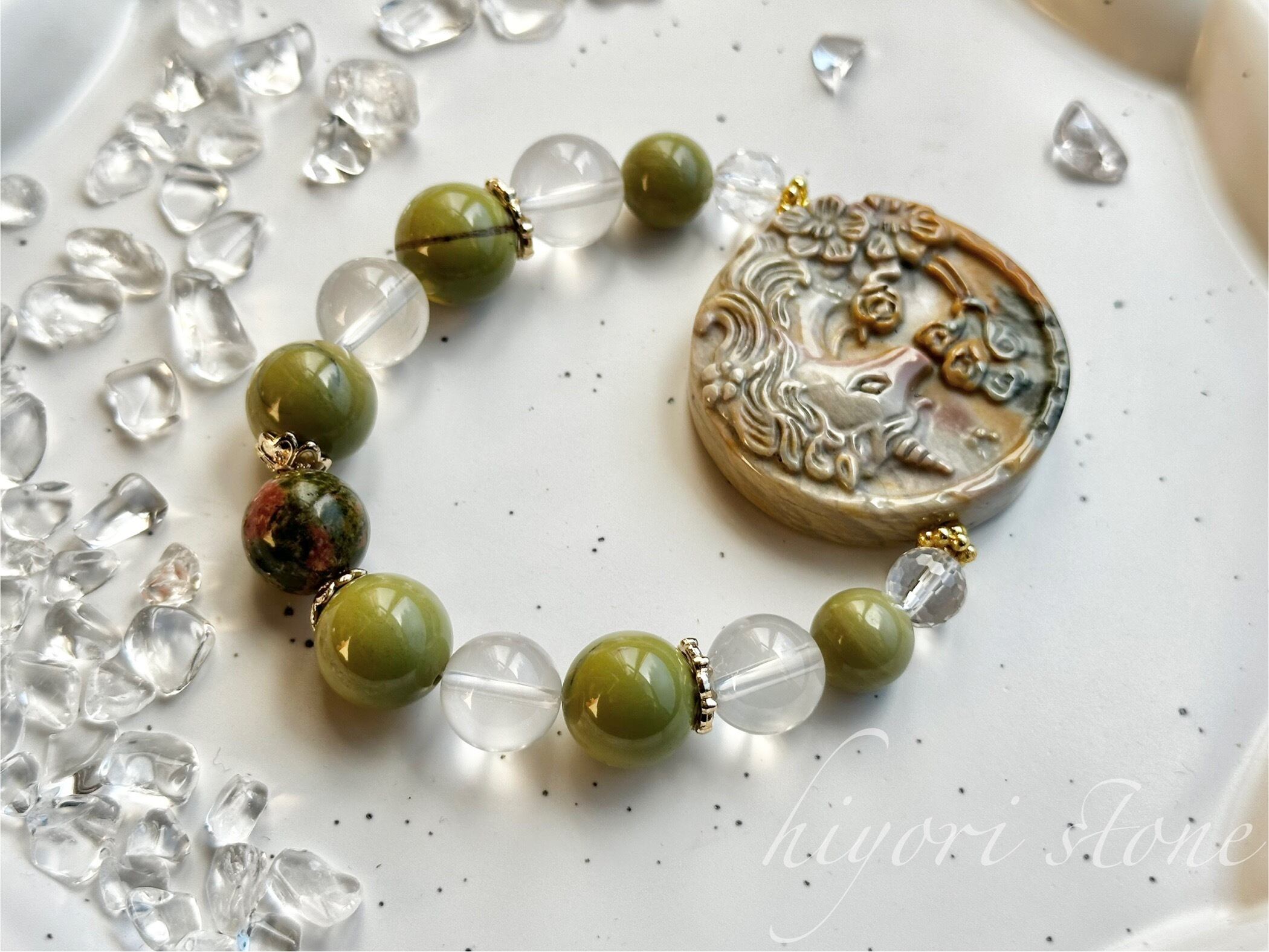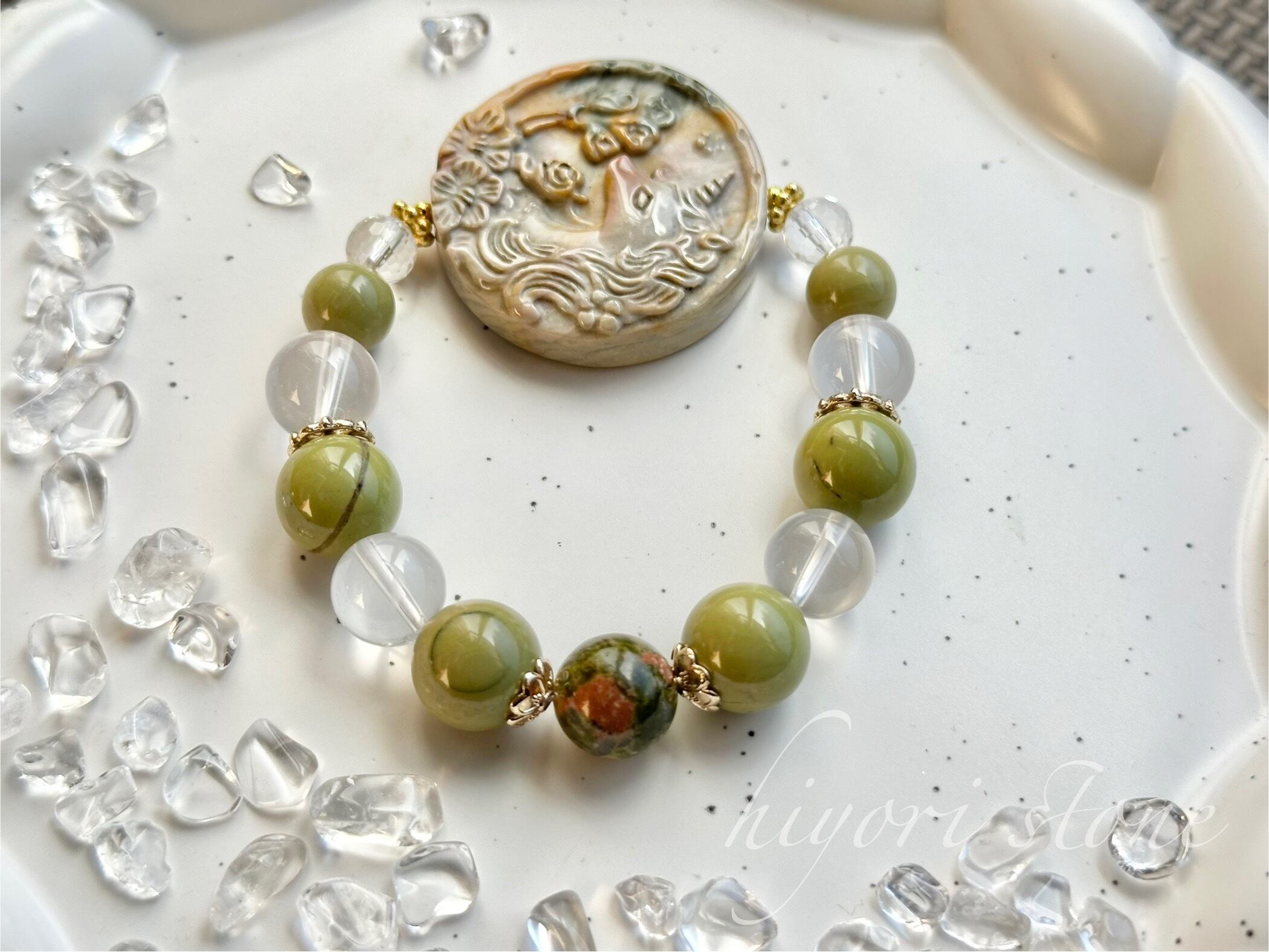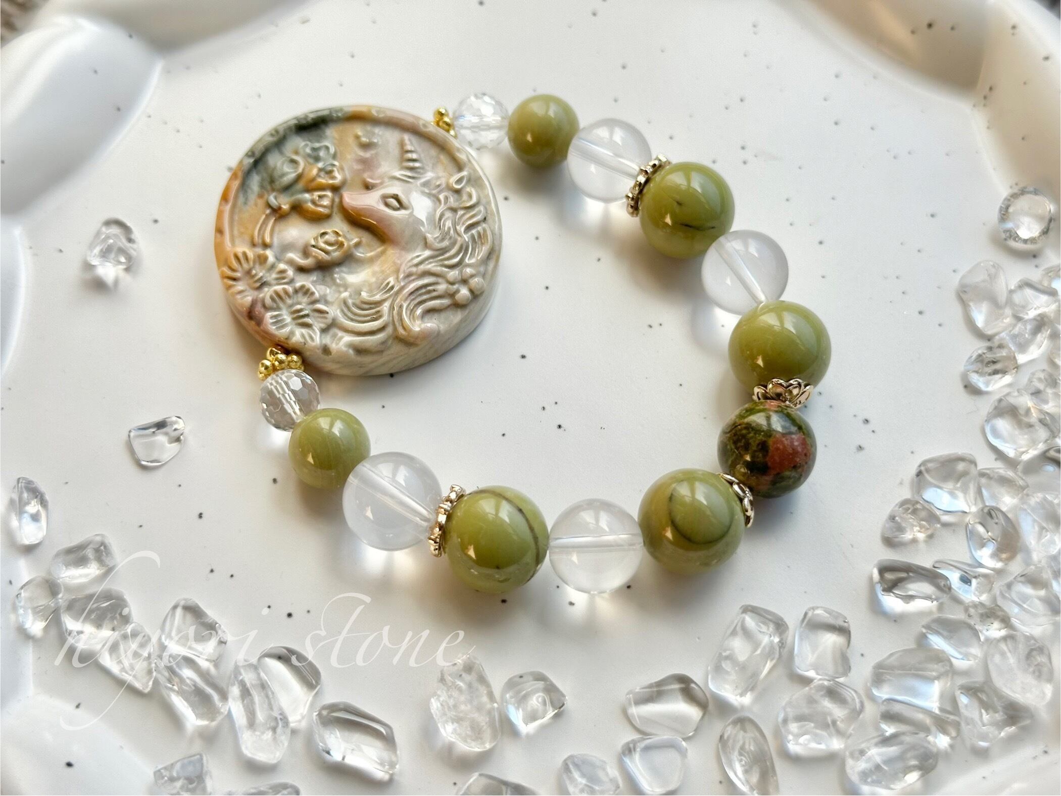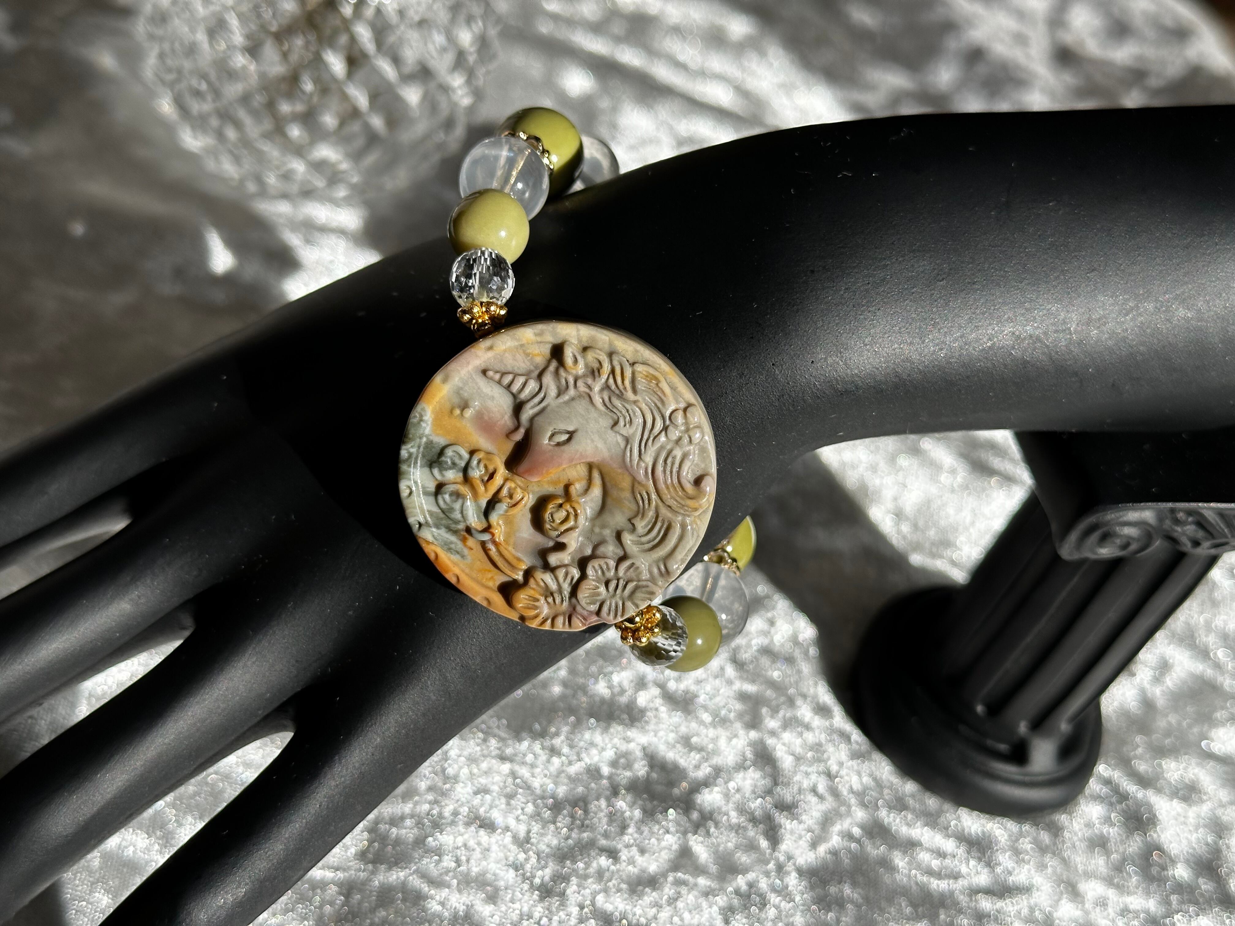 こちらのデザインブレスレットは、ユニコーンの彫刻が施されたアラシャン瑪瑙をメインにあしらい、ユナカイト・ミルク水晶・水晶を組み合わせて仕上げています。