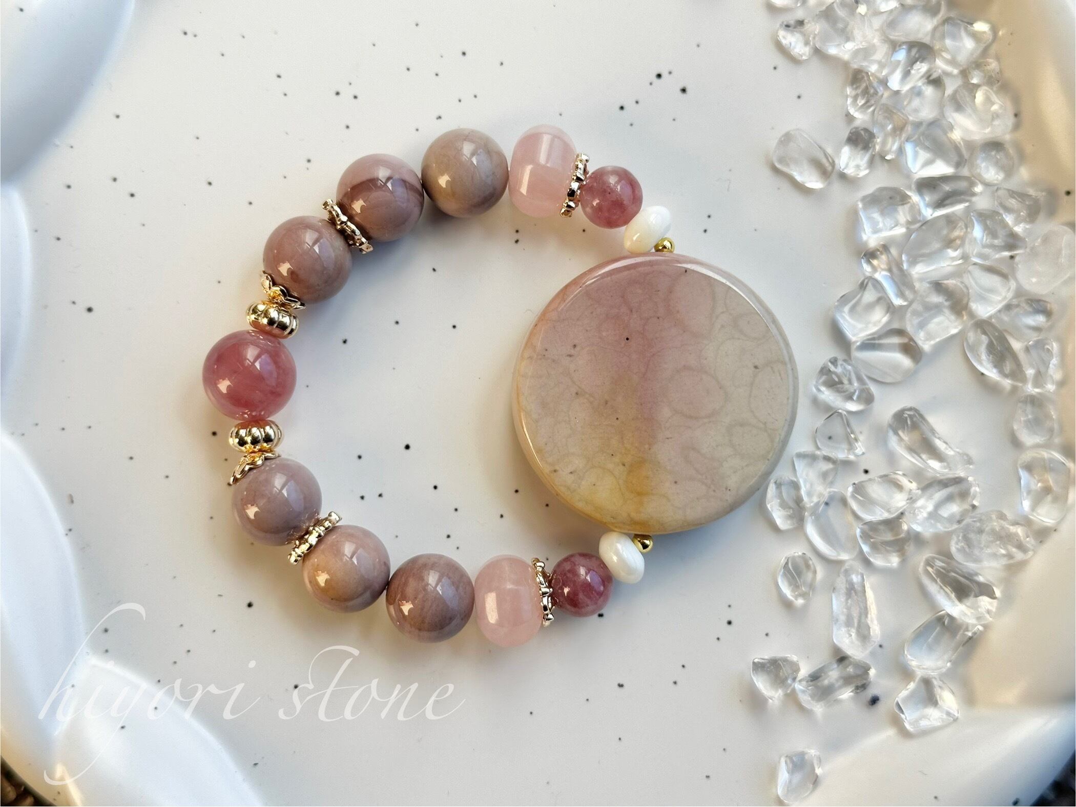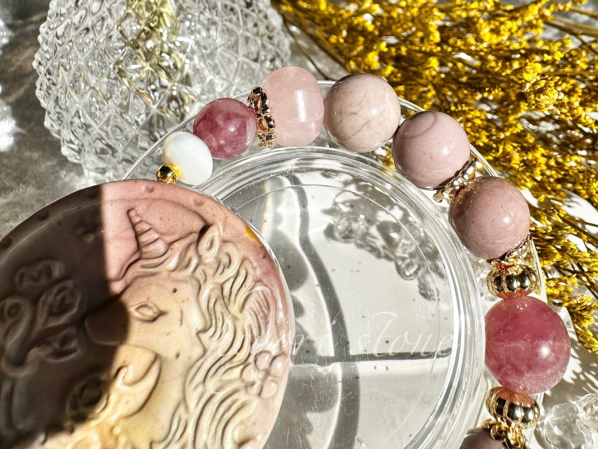 こちらのデザインブレスレットは、ユニコーンの彫刻が施されたアラシャン瑪瑙をメインに、愛と優しさを象徴するローズ系の天然石を組み合わせています。