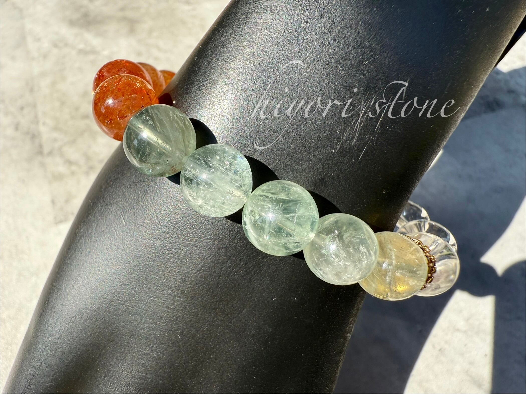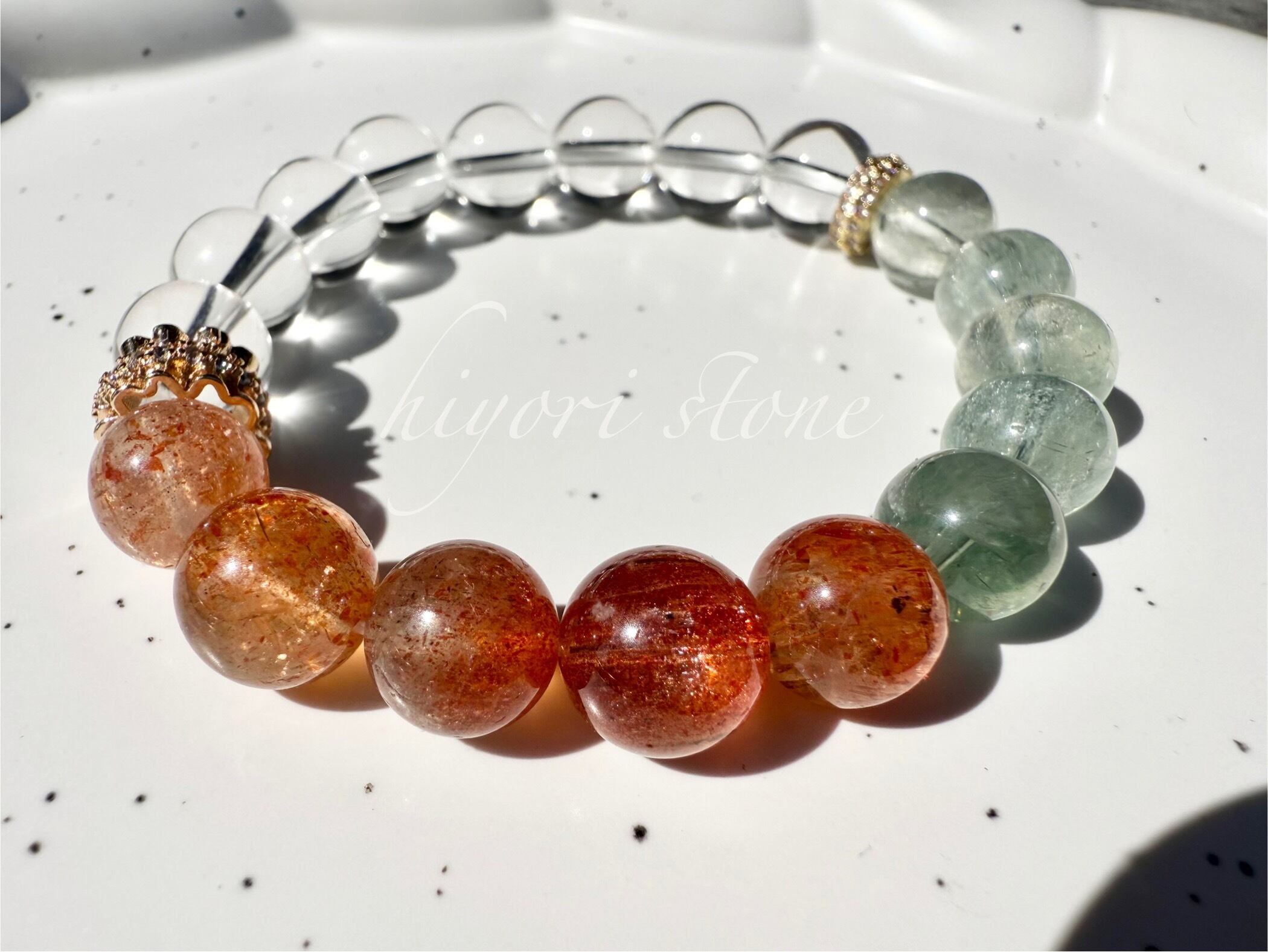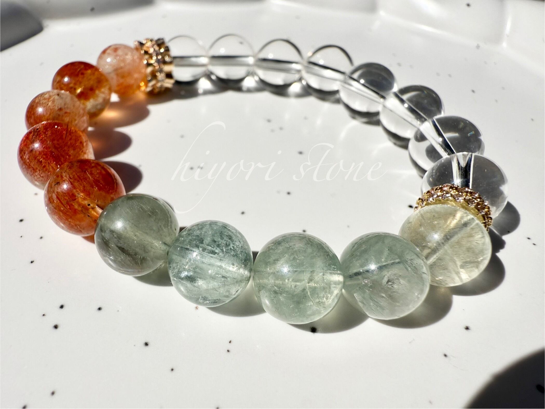 太陽のようなオレンジのきらめきと、透明感のある淡いグリーンが融合したアルーシャサンストーンに、浄化と調和をもたらす 水晶 を組み合わせています。