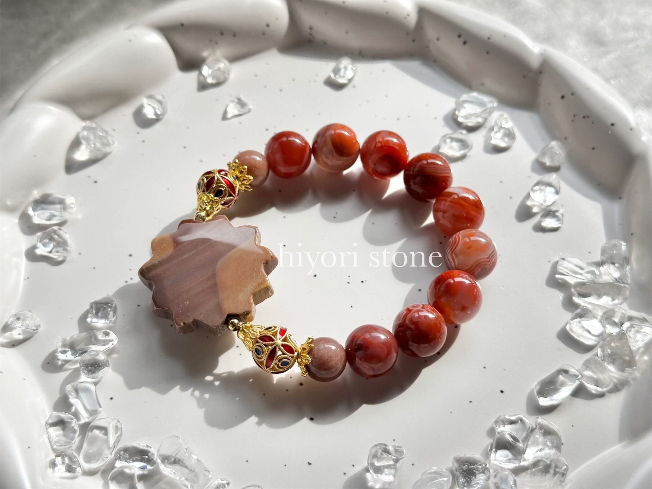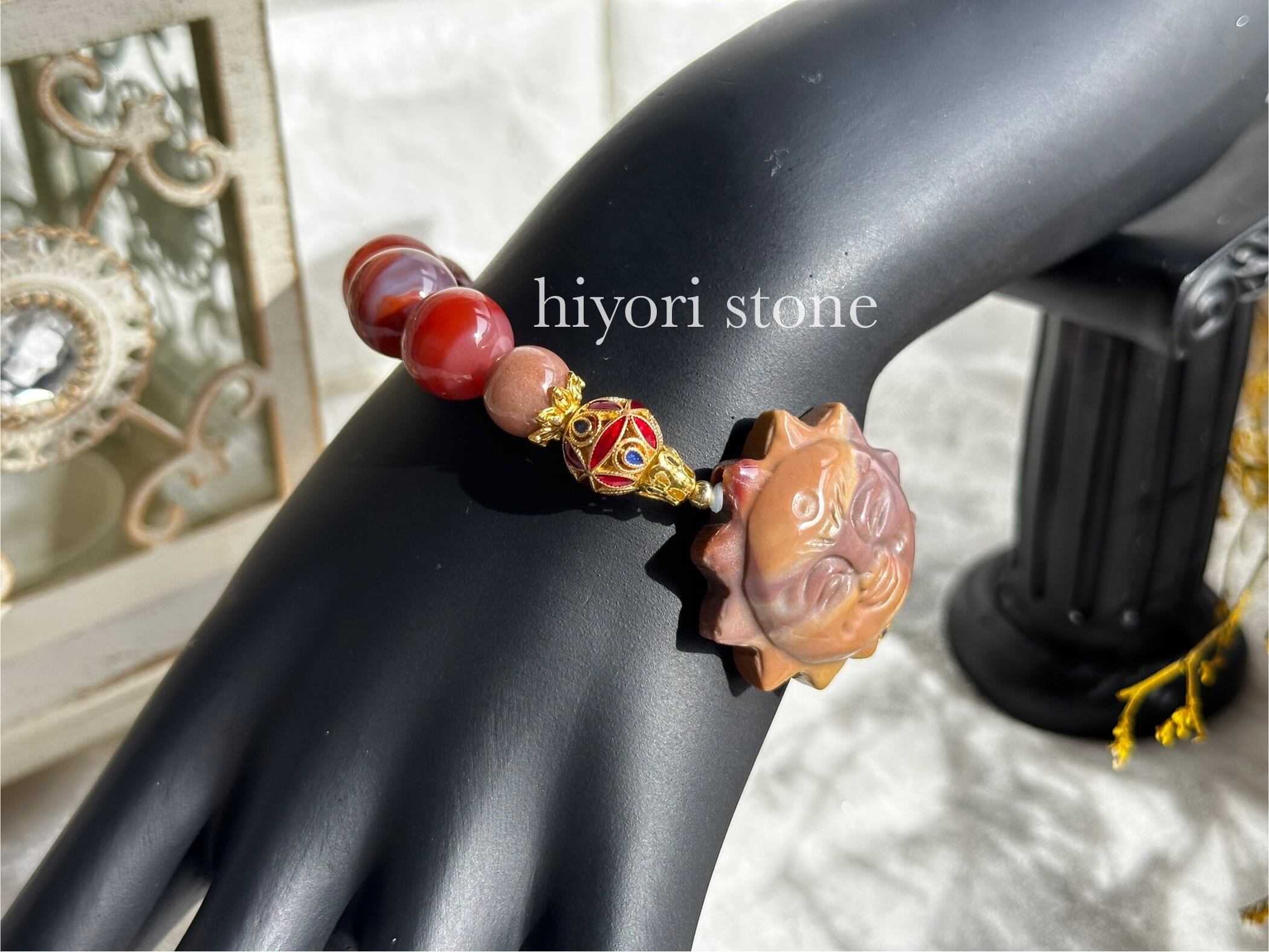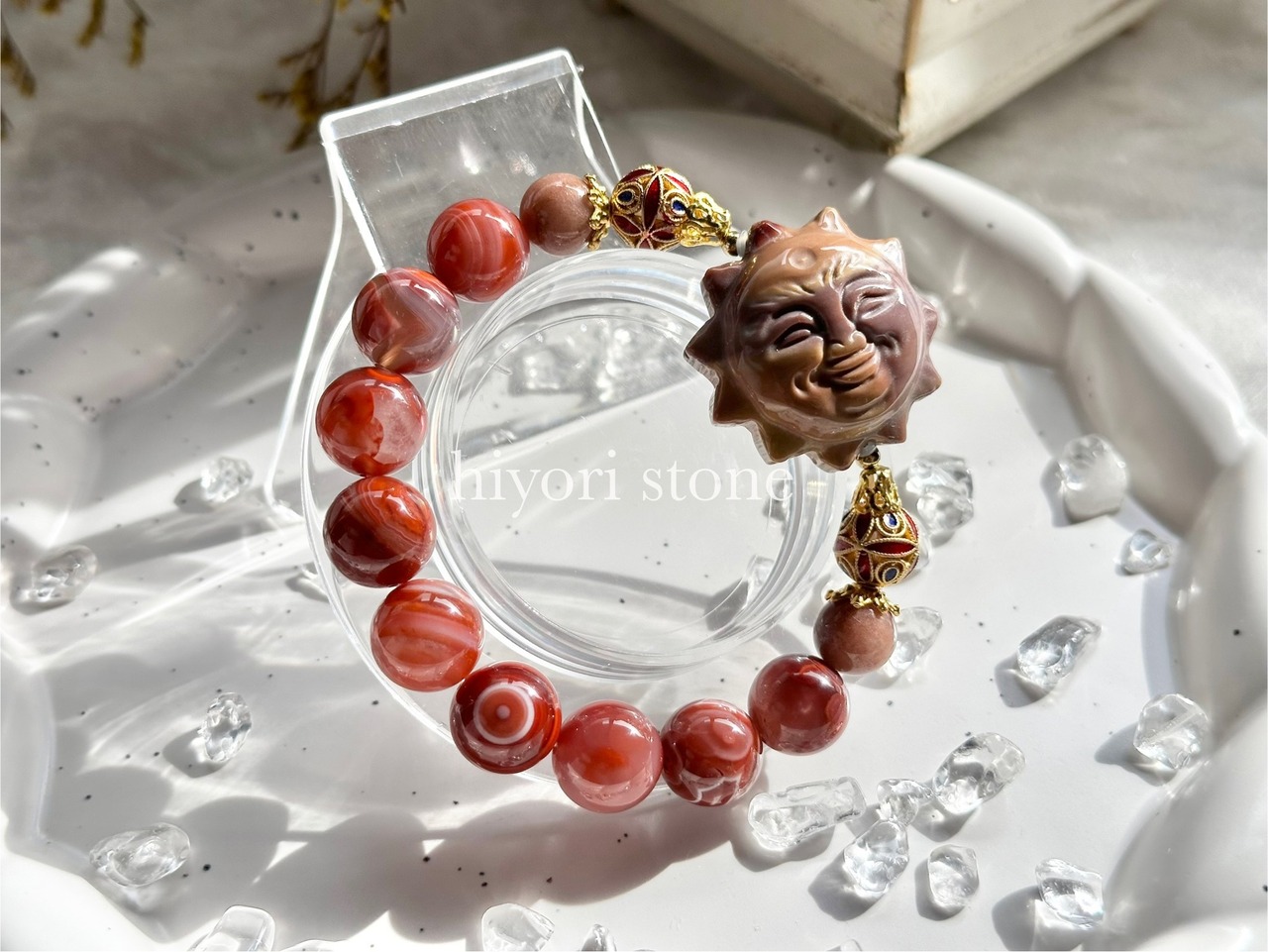 穏やかな表情のアラシャン瑪瑙の太陽パーツをメインストーンにし、そこに深みのあるオレンジレッドの彩りを添える 南紅瑪瑙(ナンホンメノウ)を組み込みました。