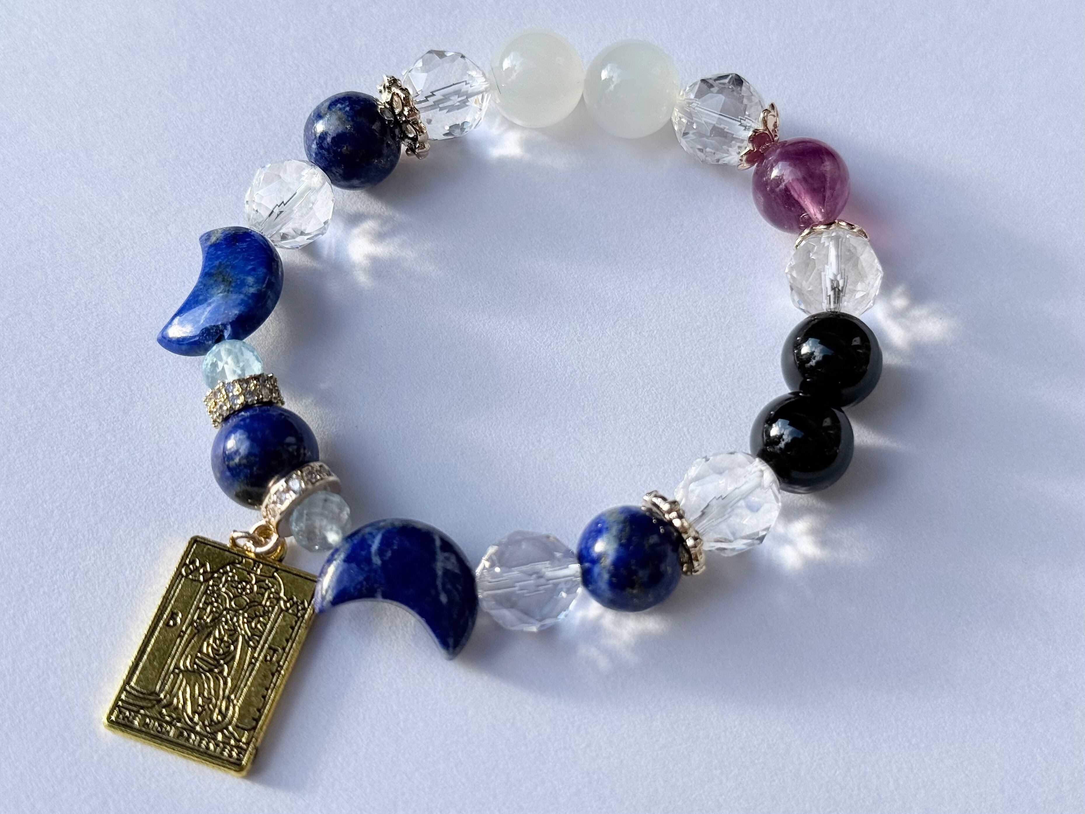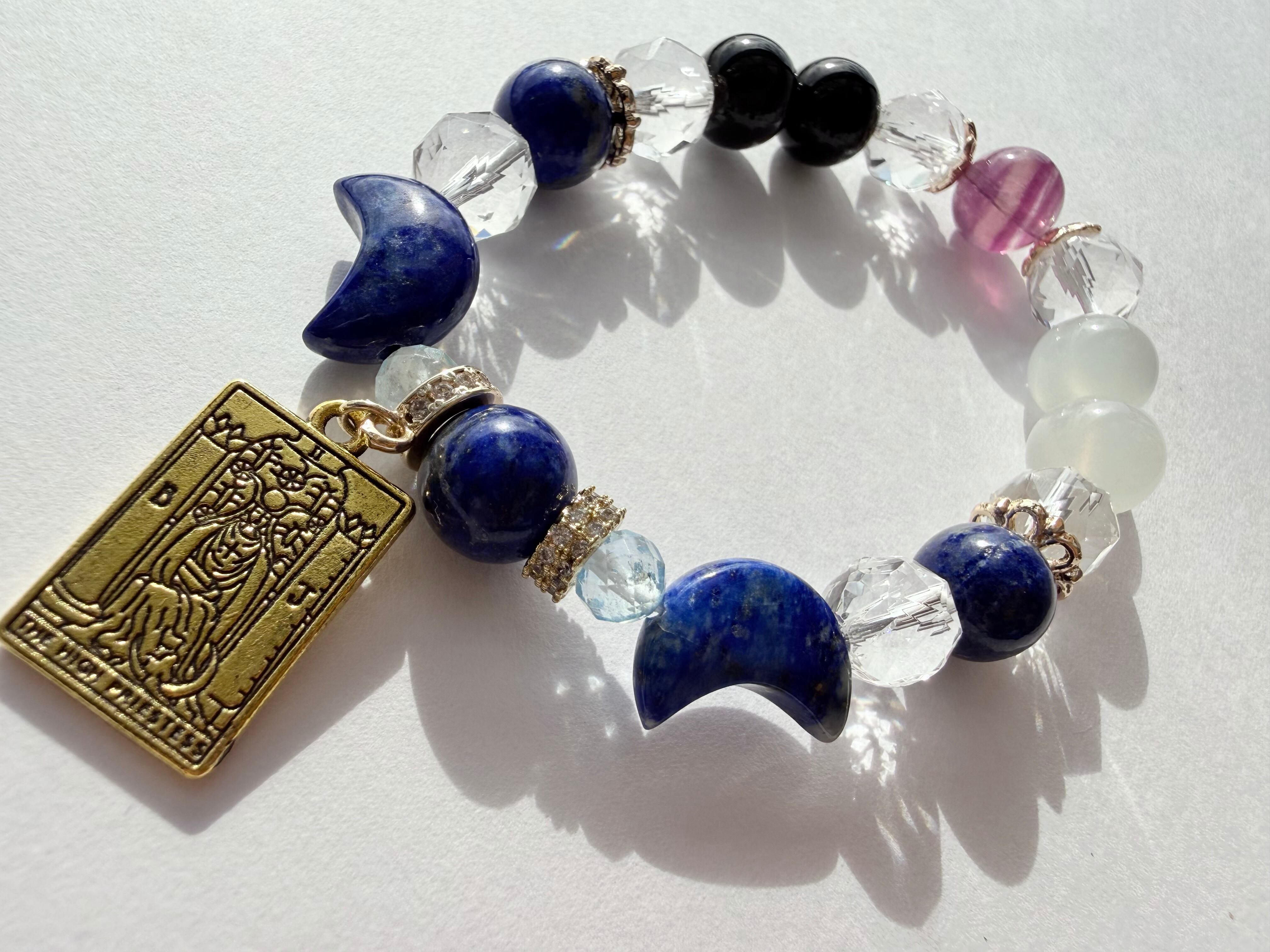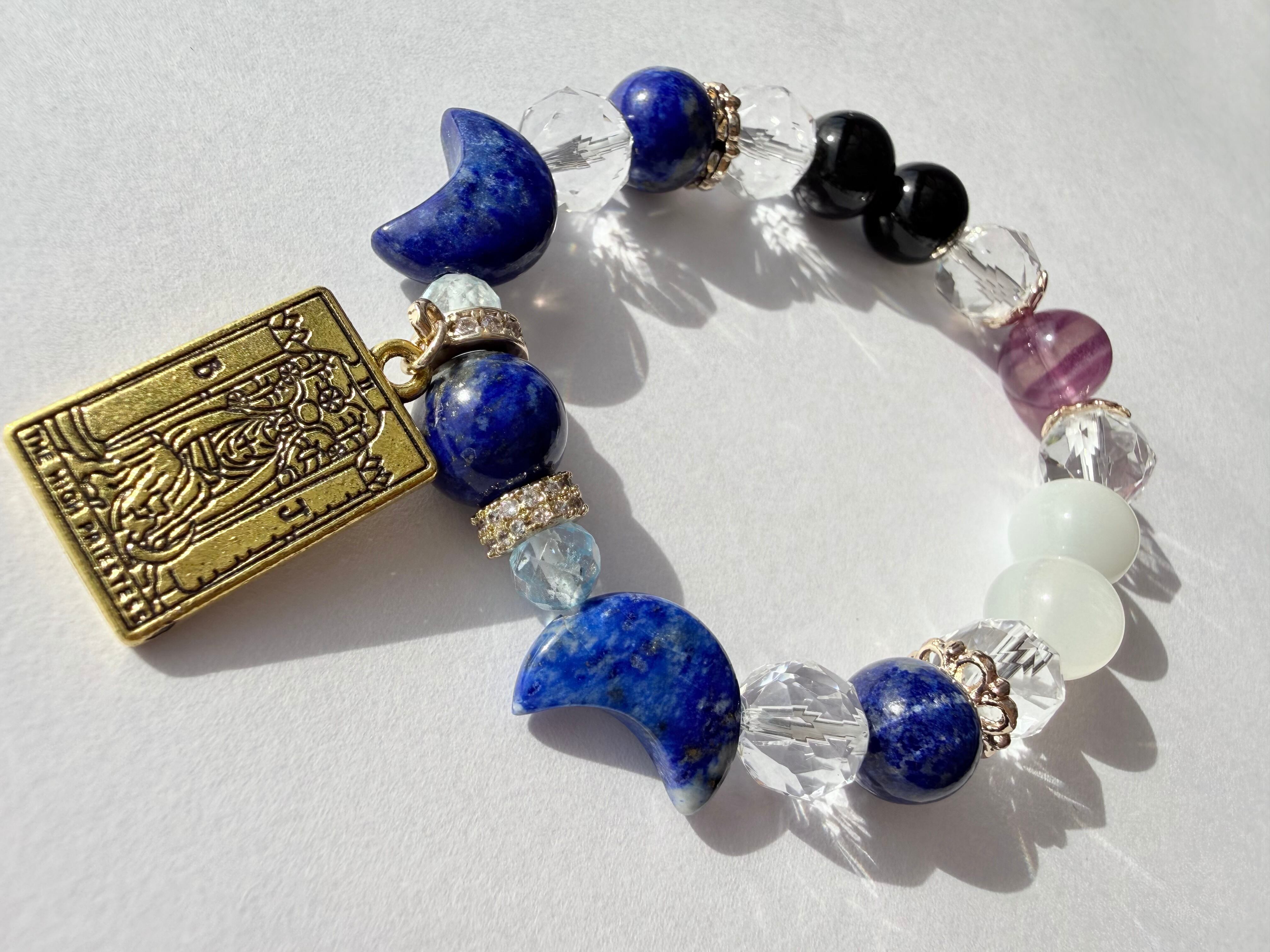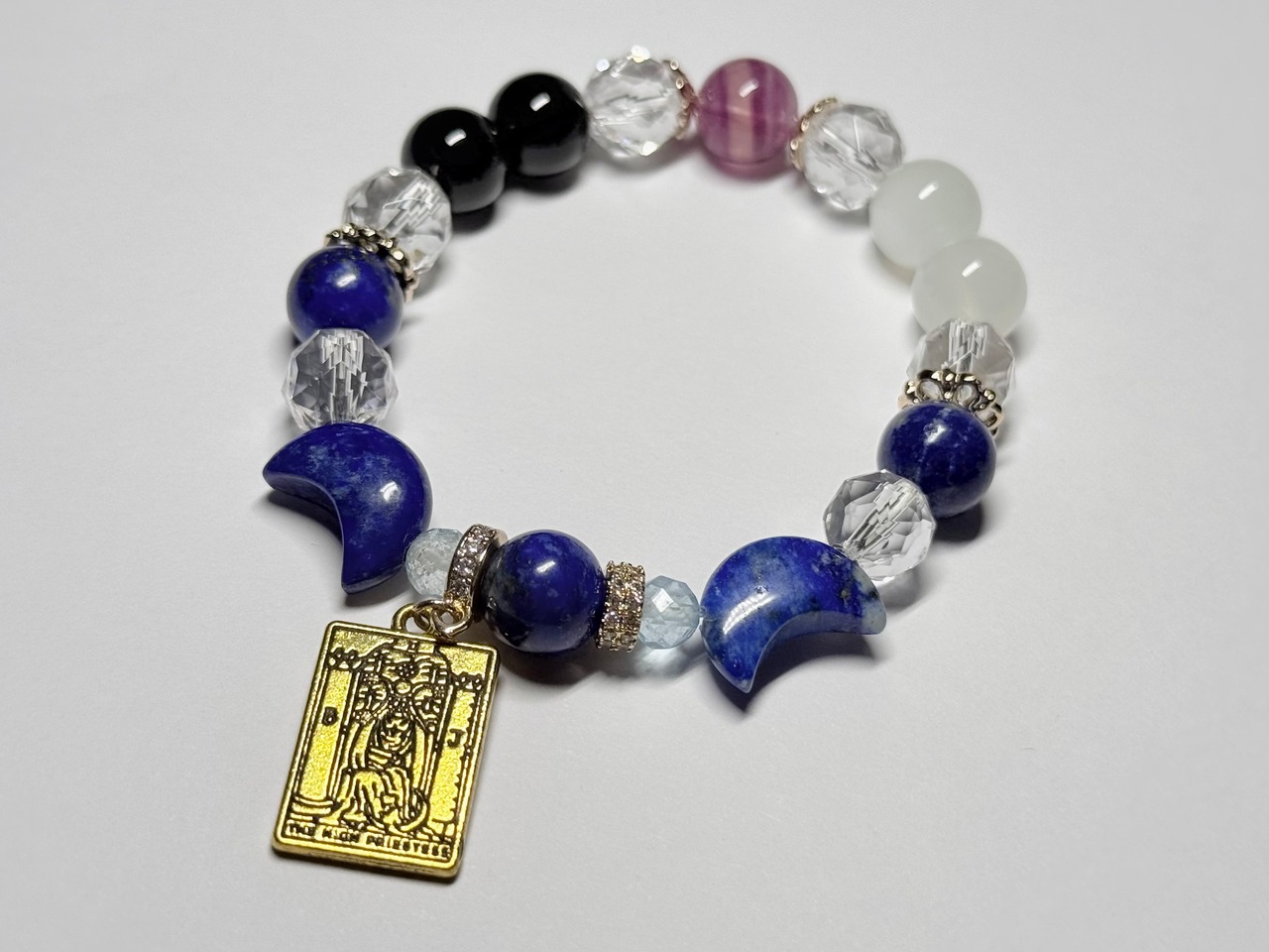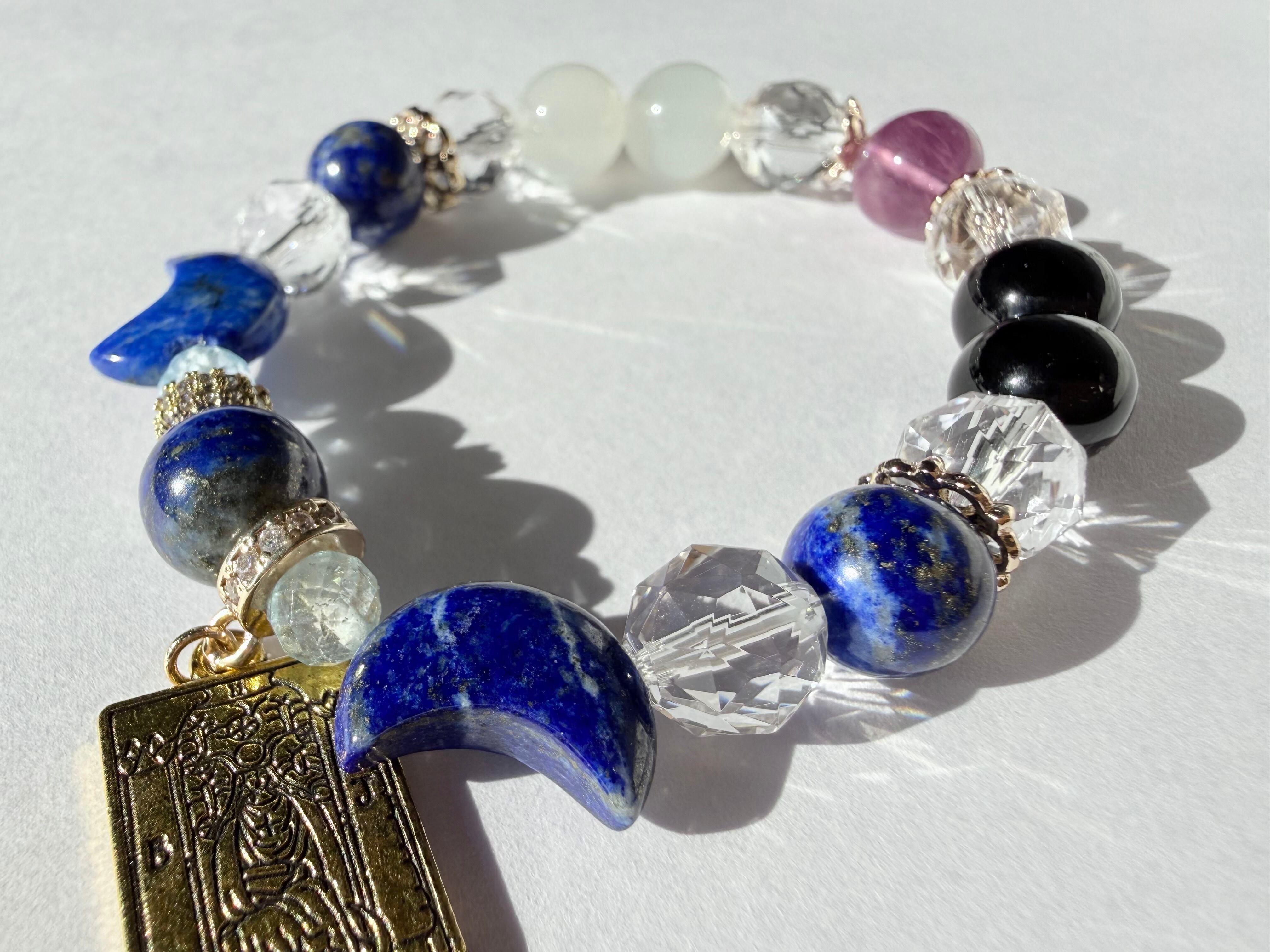こちらのデザインブレスレットは、タロットカード《女教皇(The High Priestess)》が象徴する「知性・冷静」をテーマにお作りしました。