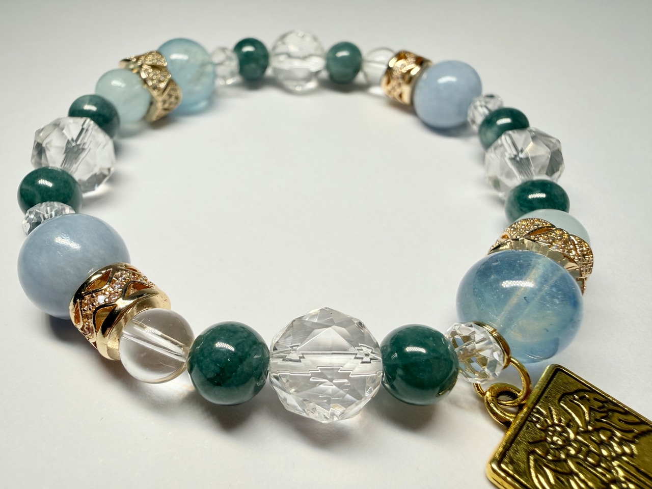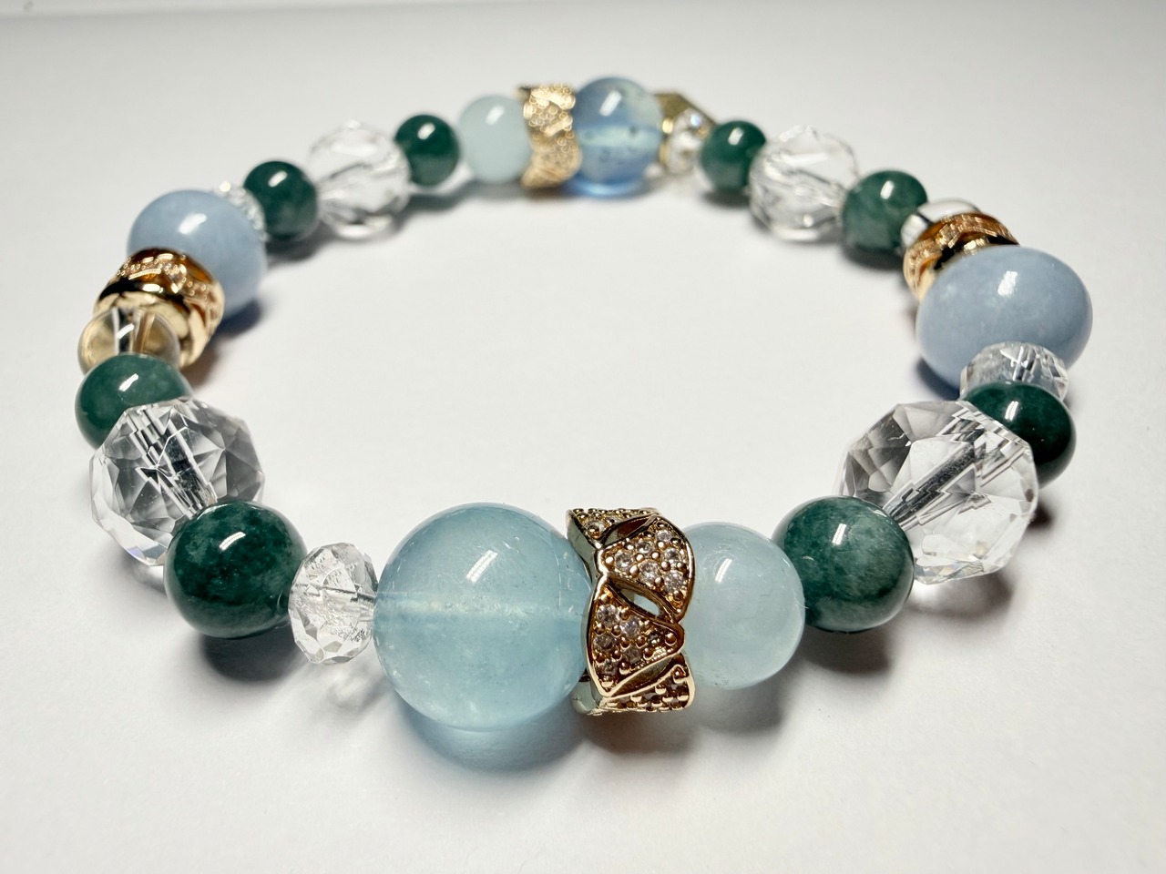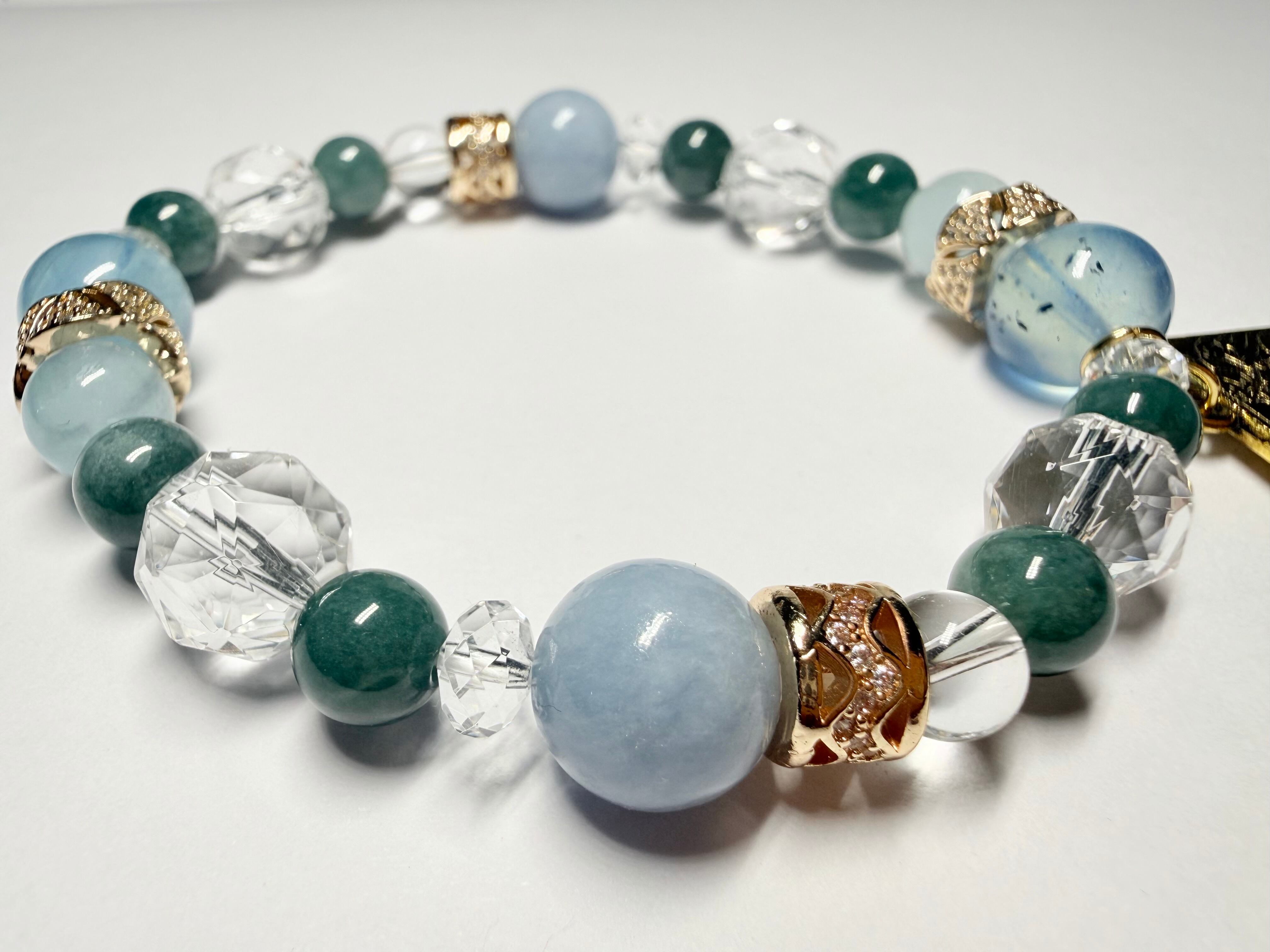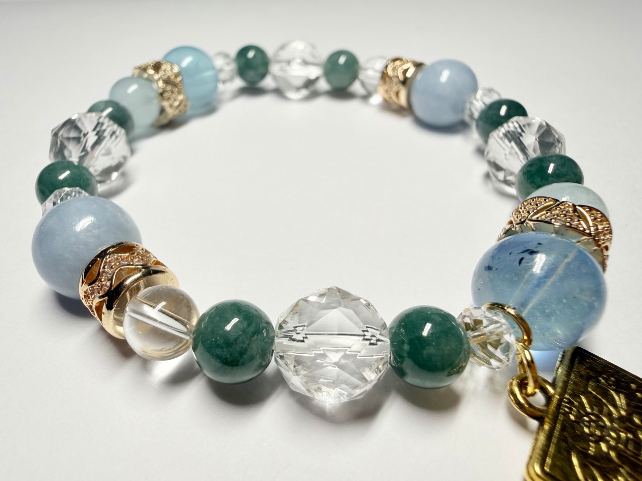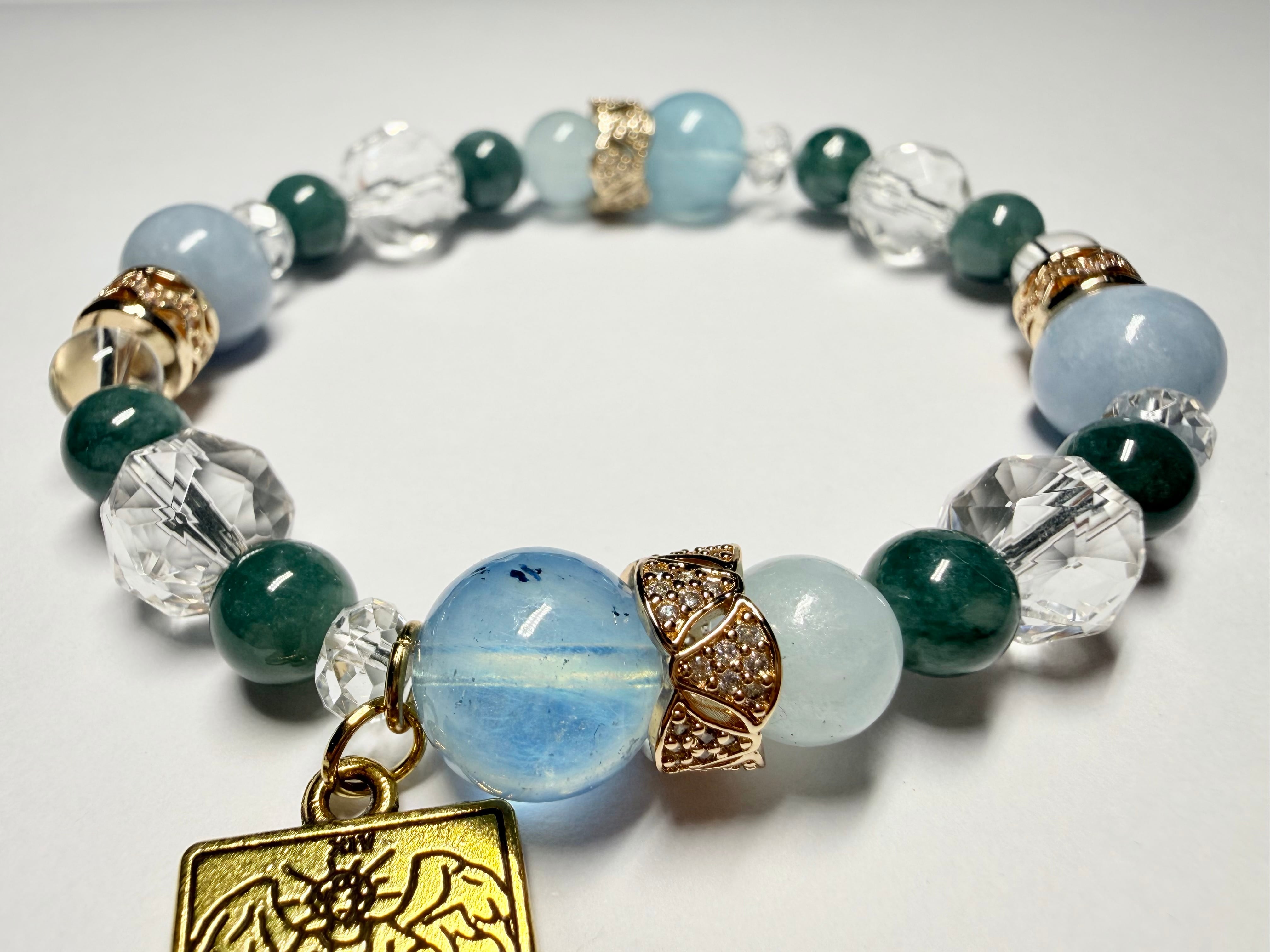 心身のエネルギーをクリアに整え、他の石たちの力を引き出しながら、ブレスレット全体を美しくまとめ上げます。