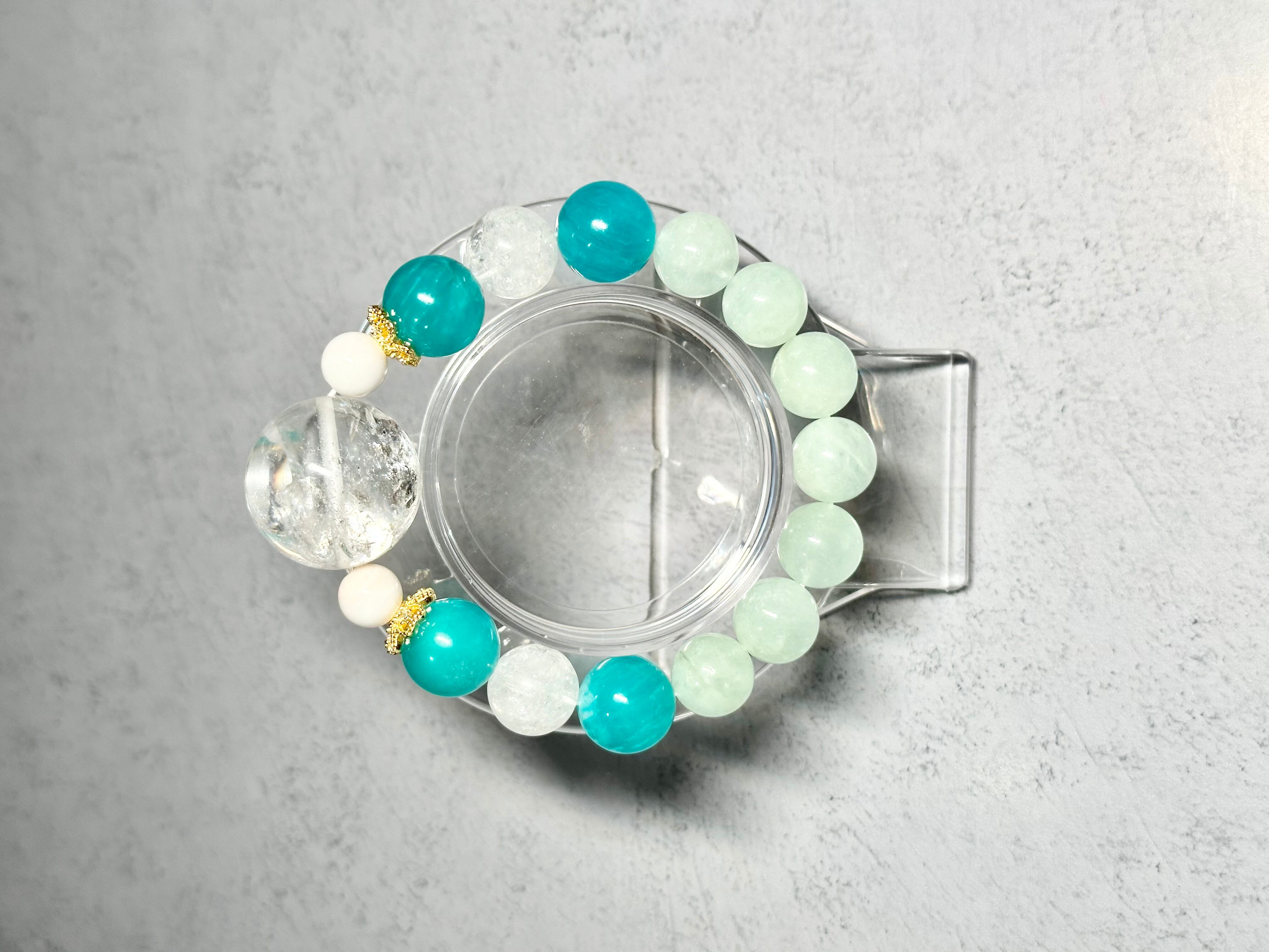 サブの石として配置したアマゾナイトシリカは、「希望の石」として有名なパワーストーンです。