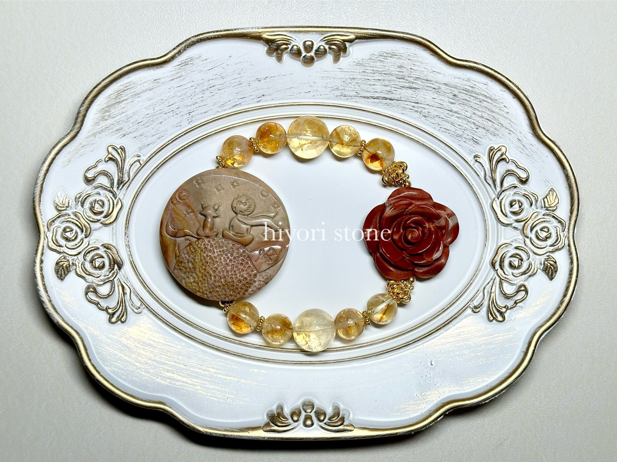 その2つを結ぶのは、星の王子さまの美しい髪色と同じ、金色に見立てたシトリンです。