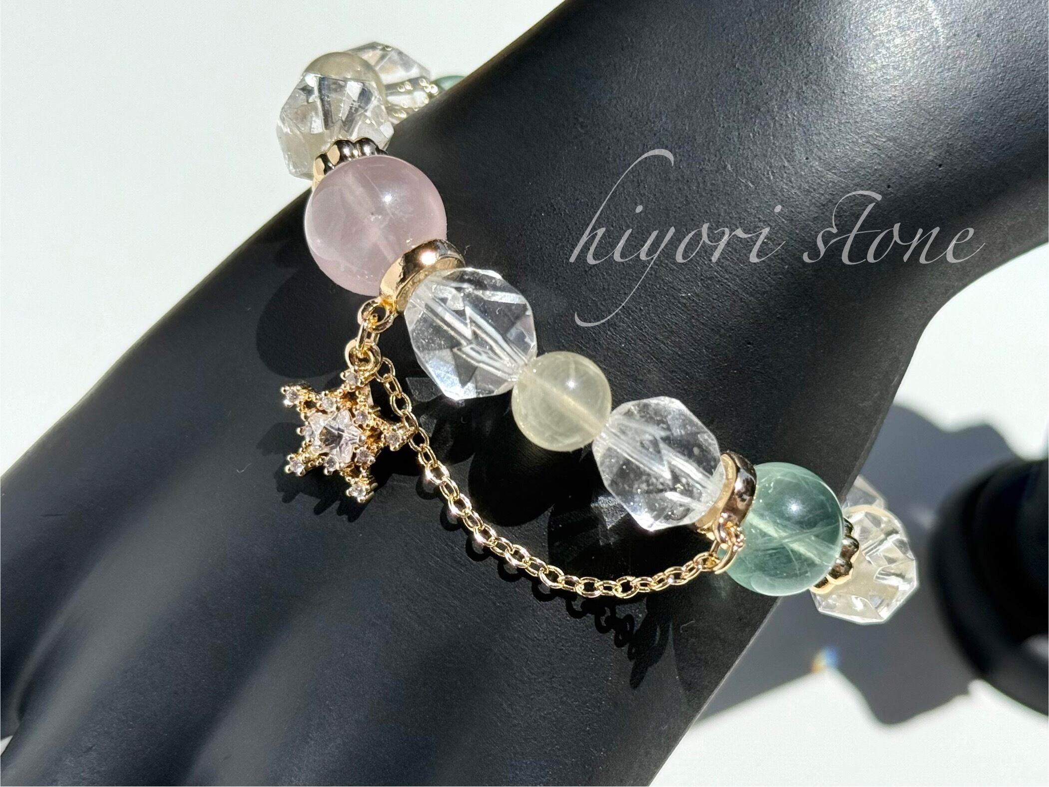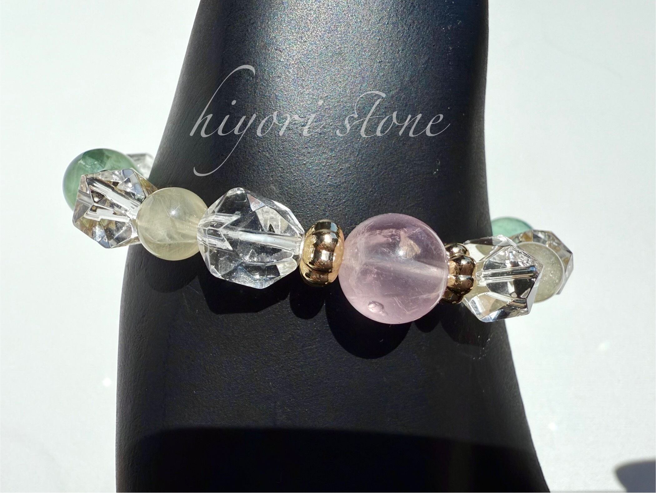 メインストーンには愛と癒しを象徴するローズクォーツと、心をクリアにするグリーンフローライトを組み込みました。